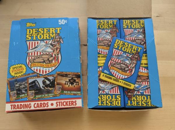 Listing includes two fairly well-preserved boxes of Topps 1991 Desert Storm Trading Cards and Stickers with 35-36 sealed packs each. First box has one opened pack (pictured) and 35 sealed, second...