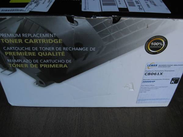 I have two C8061X, black, high-yield, premium replacement toner cartridges for HP Laser Jet 4100 series printers. They have not been opened. Original full retail is $202.99. Asking $20 a piece.