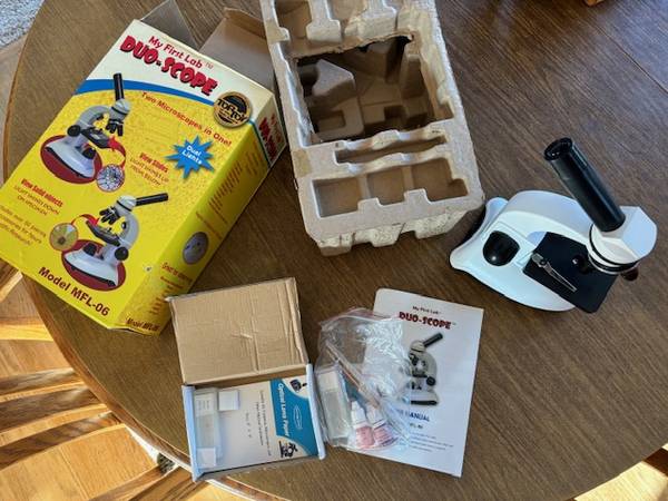 Opened and unused microscope recommended for ages 9-18 years old. Includes over 50 pieces of accessories. All pieces, accessories, slides, slide paper and instructions included.