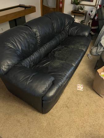 Blue leather couch. Cushions are a little worn where you sit but the rest of it is in really good shape. Very comfortable, nothing wrong with it other than I need room for my new reclining couch....